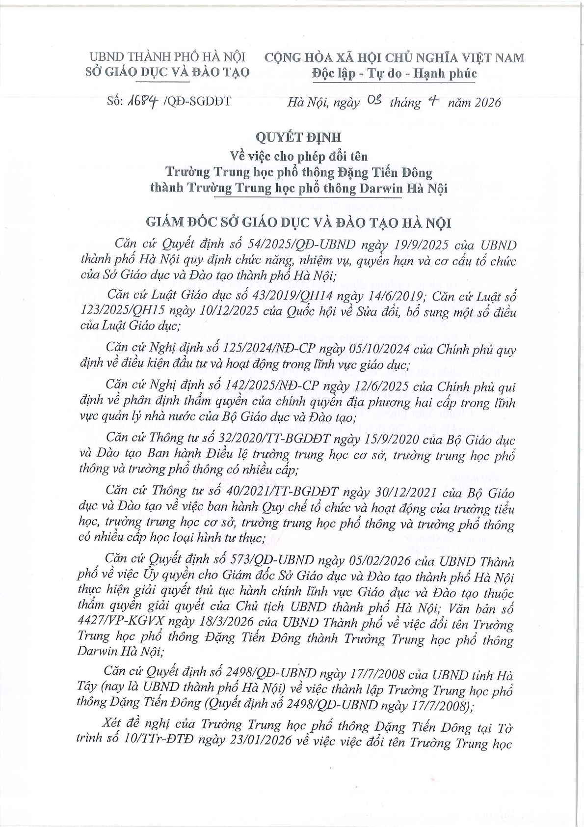 SỞ GIÁO DỤC VÀ ĐÀO TẠO HÀ NỘI – QUYẾT ĐỊNH VỀ VIỆC CHO PHÉP ĐỔI TÊN TRƯỜNG THPT ĐẶNG TIẾN ĐÔNG THÀNH TRƯỜNG THPT DARWIN HÀ NỘI